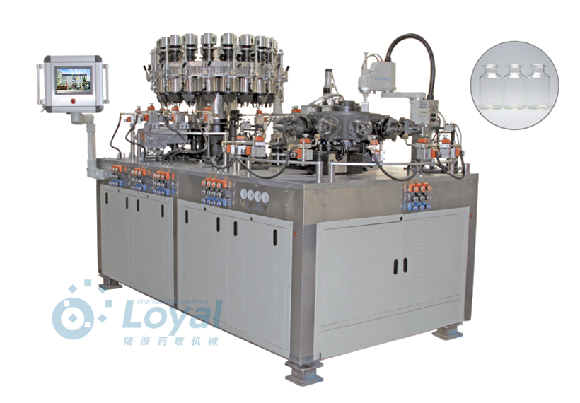 西林瓶生產線包括:自動上管、自動成型、經機械手轉換至前端檢測線(也叫生產管控)、檢測線檢測的項目:1、瓶口內外徑 2、瓶身長短 3、瓶身外徑 4、瓶口邊厚 5、瓶底內凹尺寸檢測;經檢測后的合格品再用機械手夾盤轉換至退火爐網帶上,經高溫減除應力后再降溫,通過氣動吸盤將回火后的小瓶轉換至后端檢測線,后端檢測(也是重檢也叫終檢),經后端拍照檢測項目